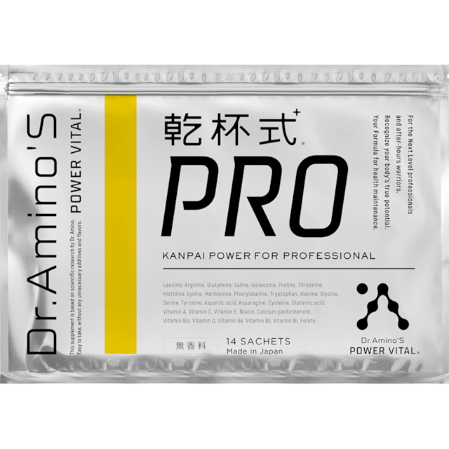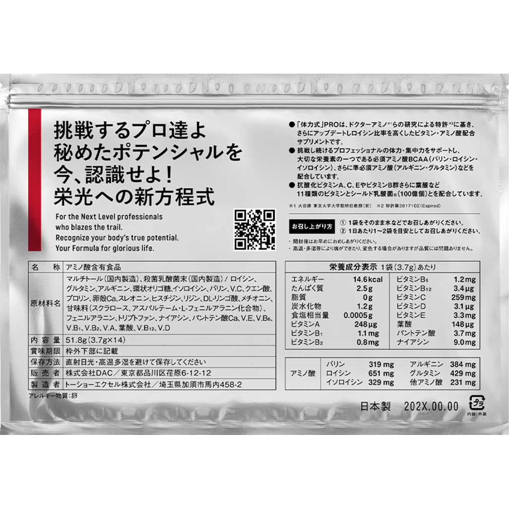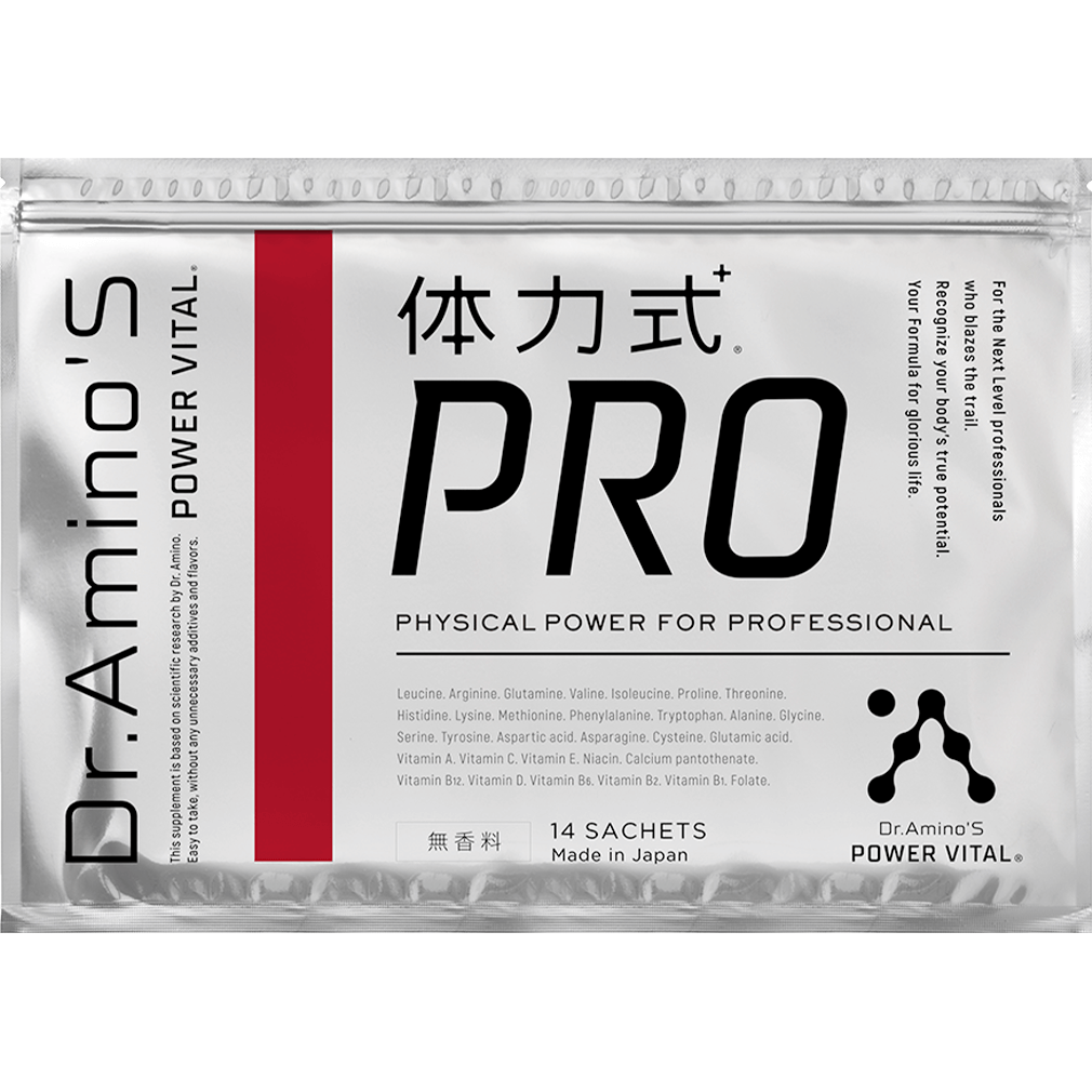 ●「体力式」PROは、ドクターアミノ※1らの研究による特許※2に基き、さらにアップデートしロイシン比率を高くしたビタミン・アミノ酸配合サプリメントです。